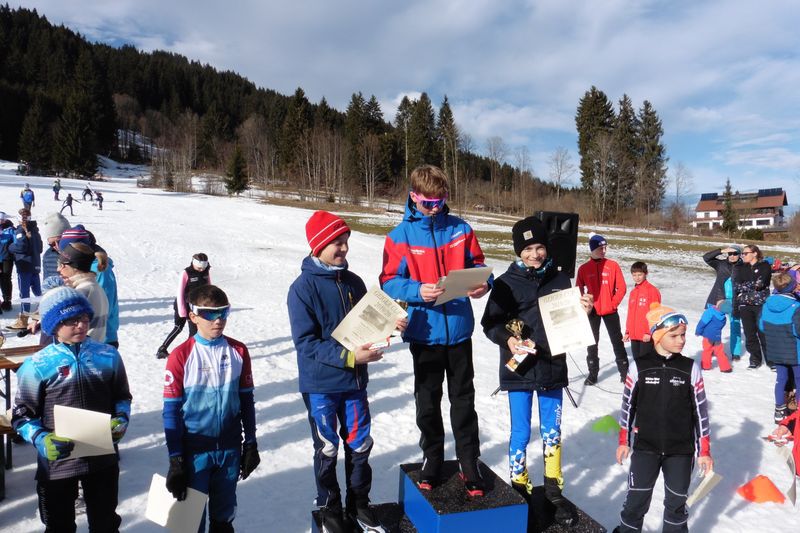 Am Samstagnachmittag ging es mit dem Nachwuchs gleich beim Mini-Ski-Trail über 2km und 4km weiter. An den Start gingen hier die 8 bis 15 jährigen in der Skat-Technik. Der Massenstart sorgt im Vorfeld immer für reichlich Nervosität, doch diese legt sich sobald die Teilnehmer am Start auf die Strecke gehen. Angefeuert durch die vielen Zuschauer, Eltern und Trainer geben die jungen Athleten alles. So erkämpfte sich Jakob Haff-Winkelmann in der Klasse Kinder 1 gleich einen Sieg. Einen spektakulären Zielsprint lieferten sich Nele Händel, Mayelle Staiger und Ida Eberle, bei dem Nele als Siegerin hervor ging, dicht gefolgt von ihren Mannschafts-Kameradinnen vom SCP, Maryella und Ida, alle Schülerklasse II, die alle innerhalb von 2 Sekunden die Ziellinie überquerten. Platz 4 ging an Ole Händel S8, Rang 5 erliefen sich Tim Bosse S10 und Anna Happ S15.Jeweils einen 7 Rang konnten Eva S10 und Anna Kling S15 für sich verbuchen. Platz neun belegten Lea Happ S10 und Lisa Vogler S15. Die Siegerehrung mit Peter Schlickenrieder war dann nach den vielen guten Ergebnissen noch mal ein Highlight für die Kinder.