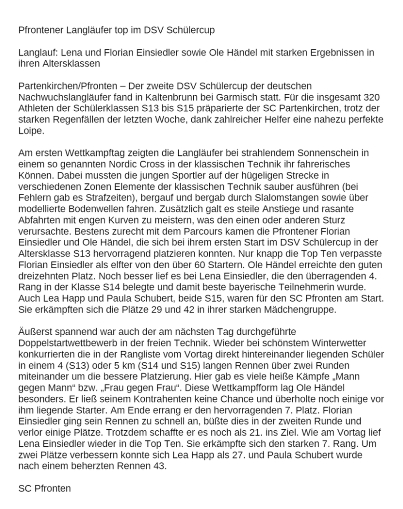 Die ersten Rennen der Serie des Deutschen Schüler-Cup (sechs Wettbewerbe insgesamt) in dieser Saison wurden am Wochenende gestartet. Die Organisatoren des austragenden Skiclub Niederwangen musste wegen Schneemangel nach Sulzberg /Vorarlberg ausweichen, und fanden dort gute Bedingungen vor. Der Schneefall in der Nacht zuvor erforderte einiges an Wachskunst der Trainer, um optimale Skier zu präparieren. Die 14jährige Amelie Geyer vom SC-Pfronten kam mit der selektiven Strecke über 5 km Klassisch und ihren bestens präparierten Skiern sehr gut zurecht und lief mit knappem Rückstand auf den 3. Rang, und somit aufs Podest. Amelie zeigte sich selbst überrascht über ihr gutes Ergebnis, „ Ich hätte nicht gedacht, dass ich gleich beim ersten Rennen und bei dieser schweren Strecke aufs Stockerl laufe“. Auch ein Nordic-Cross in der Freien Technik stand am andern Tag auf dem Programm, das ist ein Technik-Kurs auf der Ebene sowie im steilen Gelände. Auch hier bewies die junge Pfrontnerin ihr Können, und lief nach einem kleinen Missverständnis des Starters und der Athletin am Start, noch auf den fünften Platz. Ihr Trainer Sepp Rederer „ Auch das hätte leicht für einen Podest-Platz gereicht“, lag sie doch nur 3,9 Sekunden hinter dem 3. Rang. Beachtlich schlug sich auch der zweite Teilnehmer des SCP, Jonas Glöckner, in der stark besetzten Klasse S14. Auf der Langstrecke im Klassischen Stil belegte er den 36. Rang, und beim Cross kam er auf den 45. Platz. Trainer Sepp Rederer meinte schmunzelnd „ Noch Ausbau fähig“, war aber mit seinen Schützlingen hoch zufrieden.